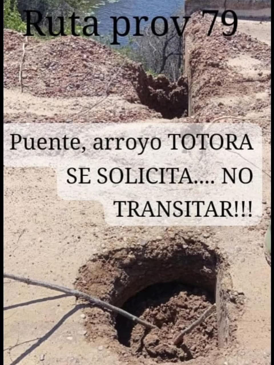 El Consorcio Caminero N° 10 “San Francisco” informó el corte total de la Ruta Provincial 79 a la altura del puente sobre el arroyo Totora, debido al desmoronamiento del cabezal de la estructura.