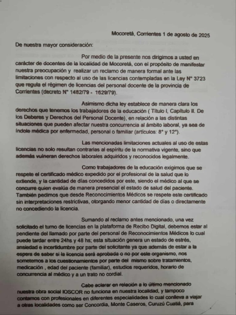 Mocoretá, Corrientes – Un grupo de docentes de la localidad de Mocoretá presentó una nota formal a las autoridades educativas de la provincia de Corrientes para manifestar su preocupación y solicitar la revisión del régimen de licencias médicas previsto en la Ley N° 3723 (decretos 1482/79 y 1629/79).