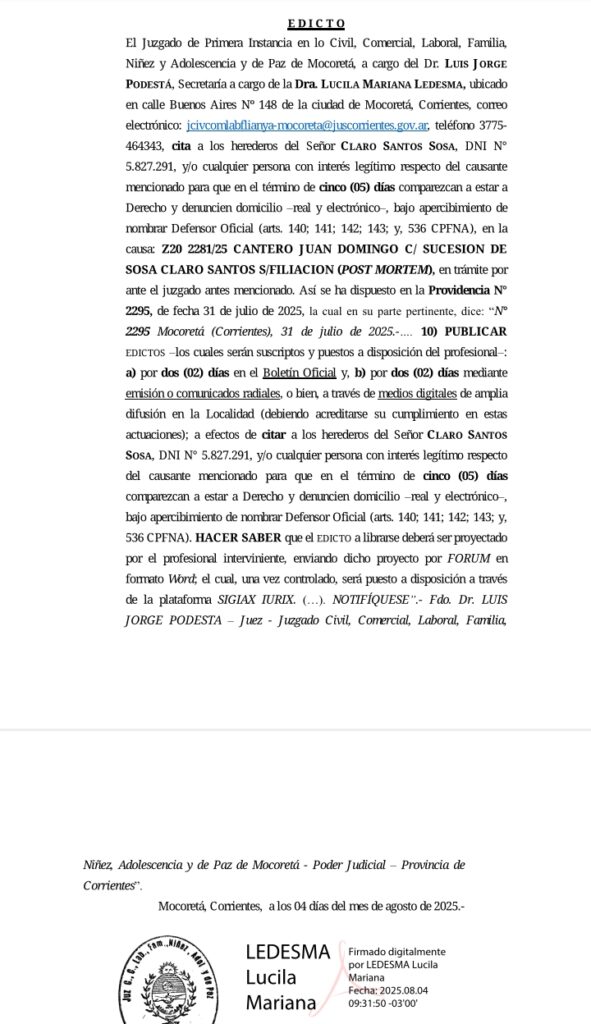El Juzgado de Primera Instancia en lo Civil, Comercial, Laboral, Familia, Niñez y Adolescencia y de Paz de Mocoretá, a cargo del Dr. LUIS JORGE PODESTÁ, Secretaría a cargo de la Dra. LUCILA MARIANA LEDESMA, ubicado en calle Buenos Aires N° 148 de la ciudad de Mocoretá, Comientes, correo electrónico: jcivcomlabflianya-mocoreta@juscorrientes.gov.ar, teléfono 3775-464343, cita a los herederos del Señor CLARO SANTOS SOSA, DNI N° 5.827.291, y/o cualquier persona con interés legítimo respecto del causante mencionado para que en el término de cinco (05) días comparezcan a estar a Derecho y denuncien domicilio real y electrónico, bajo apercibimiento de nombrar Defensor Oficial (arts. 140; 141; 142; 143; y, 536 CPFNA), en la causa: Z20 2281/25 CANTERO JUAN DOMINGO C/ SUCESION DE SOSA CLARO SANTOS S/FILIACION (POST MORTEM), en trámite por ante el juzgado antes mencionado. Así se ha dispuesto en la Providencia N° 2295, de fecha 31 de julio de 2025, la cual en su parte pertinente, dice: «N» 2295 Mocoretá (Corrientes), 31 de julio de 2025….. 10) PUBLICAR EDICTOS -los cuales serán suscriptos y puestos a disposición del profesional-: a) por dos (02) días en el Boletin Oficial y, b) por dos (02) días mediante emisión o comunicados radiales, o bien, a través de medios digitales de amplia difusión en la Localidad (debiendo acreditarse su cumplimiento en estas actuaciones); a efectos de citar a los herederos del Señor CLARO SANTOS SOSA, DNI N° 5.827.291, y/o cualquier persona con interés legítimo respecto del causante mencionado para que en el término de cinco (05) días comparezcan a estar a Derecho y denuncien domicilio real y electrónico, bajo apercibimiento de nombrar Defensor Oficial (arts. 140; 141; 142; 143; y, 536 CPFNA). HACER SABER que el EDICTO a librarse deberá ser proyectado por el profesional interviniente, enviando dicho proyecto por FORUM en formato Word, el cual, una vez controlado, será puesto a disposición a través de la plataforma SIGIAX IURIX. (…). NOTIFIQUESE». Fdo. Dr. LUIS JORGE PODESTA Juez Juzgado Civil, Comercial, Laboral, Familia, niñez y adolescencia y de paz de Mocoretá.