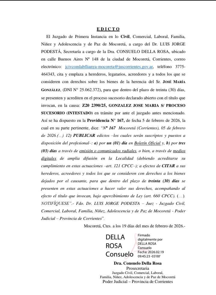 El Juzgado de Primera Instancia en lo Civil, Comercial, Laboral, Familia, Niñez y Adolescencia y de Paz de Mocoretá, a cargo del Dr. LUIS JORGE PODESTÁ, Secretaría a cargo de la Dra. CONSUELO DELLA ROSA, ubicado en calle Buenos Aires N° 148 de la ciudad de Mocoretá, Corrientes, correo electrónico: jcivcomlabflianya-mocoreta@juscorrientes.gov.ar, teléfono 3775-464343, cita y emplaza a herederos, legatarios, acreedores y a todos los que se consideren con derechos sobre los bienes de la herencia del Sr. JOSÉ MARÍA GONZÁLEZ, (DNI N° 25.062.372), para que dentro del plazo de treinta (30) días, se presenten y acrediten en el proceso sucesorio declarado abierto con el título que invocan, en la causa: Z20 2390/25, GONZALEZ JOSE MARIA S/ PROCESO SUCESORIO (INTESTADO) en trámite por ante el juzgado antes mencionado. Así se ha dispuesto en la Providencia N° 167, de fecha 5 de febrero de 2026, la cual en su parte pertinente, dice: «N° 167 Mocoretá (Corrientes), 05 de febrero de 2026.(…) 12) PUBLICAR edictos los cuales serán suscriptos y puestos a disposición del profesional: a) por un (01) día en Boletín Oficial y, b) por tres (03) días a través de emisión o comunicados radiales, o bien, a través de medios digitales de amplia difusión en la Localidad (debiendo acreditarse su cumplimiento en estas actuaciones-art. 121 CPCC-); a efectos de CITAR a sus herederos, acreedores y todos los que se consideren con derechos a los bienes dejados por el causante, para que dentro del plazo de treinta (30) días se presenten en estas actuaciones a hacer valer sus derechos, acompañando al efecto el título que invocan, bajo apercibimiento de Ley (art. 660 CPCC). (…)