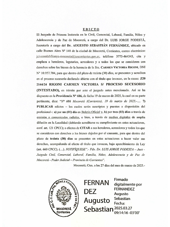 EDICTOEl Juzgado de Primera Instancia en lo Civil, Comercial, Laboral, Familia, Niñez y Adolescencia y de Paz de Mocoretá, a cargo del Dr. LUIS JORGE PODESTÁ, Secretaria a cargo del Dr. AUGUSTO SEBASTIÁN FERNÁNDEZ, ubicado en calle Buenos Aires N° 148 de la ciudad de Mocoretá, Corrientes, correo electrónico: jcivcomlabflianya-mocoreta@juscorrientes.gov.ar, teléfono 3775-464343, cita y emplaza a herederos, legatarios, acreedores y a todos los que se consideren con derechos sobre los bienes de la herencia de la Sra. CARMEN VICTORIA RIGONI, DNI N° 10.957.704, para que dentro del plazo de treinta (30) días, se presenten y acrediten en el proceso sucesorio declarado abierto con el titulo que invocan, en la causa: Z20 2144/24 RIGONI CARMEN VICTORIA S/ PROCESO SUCESORIO (INTESTADO), en trámite por ante el juzgado antes mencionado. Así se ha dispuesto en la Providencia Nº 686, de fecha 19 de marzo de 2025, la cual en su parte pertinente, dice: «N° 686 Mocoretá (Corrientes). 19 de marzo de 2025.-…. 7) PUBLICAR edictos los cuales serin suscriptos y puestos a disposición del profesional: a) por un (01) día en Boletin Oficial y, b) por tres (03) días a través de emisión o comunicados radiales, o bien, a través de medios digitales de amplia difusión en la Localidad (debiendo acreditarse su cumplimiento en estas actuaciones, conf. art. 121 CPCC); a efectos de CITAR a sus herederos, acreedores y todos los que se consideren con derechos a los bienes dejados por el causante, para que dentro del plazo de treinta (30) días se presenten en estas actuaciones a hacer valer sus derechos, acompañando al efecto el título que invocan, bajo apercibimiento de Ley (art. 660 CPCC). (…). NOTIFIQUESE».- Fdo. Dr. LUIS JORGE PODESTA – Juez-Juzgado Civil, Comercial, Laboral, Familia, Niñez, Adolescencia y de Paz de Mocoretá Poder Judicial-Provincia de Corrientes».Mocoretá, Ctes, a los 27 dias del mes de marzo de 2025.-