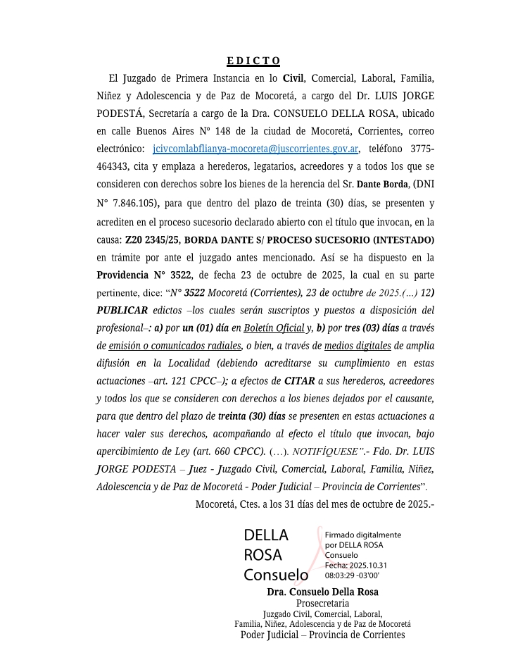 El Juzgado de Primera Instancia en lo Civil, Comercial, Laboral, Familia, Niñez y Adolescencia y de Paz de Mocoretá, a cargo del Dr. LUIS JORGE PODESTÁ, Secretaría a cargo de la Dra. CONSUELO DELLA ROSA, ubicado en calle Buenos Aires N° 148 de la ciudad de Mocoretá, Corrientes, correo electrónico: jcivcomlabflianya-mocoreta@juscorrientes.gov.ar, teléfono 3775-464343, cita y emplaza a herederos, legatarios, acreedores y a todos los que se consideren con derechos sobre los bienes de la herencia del Sr. Dante Borda, (DNI N° 7.846.105), para que dentro del plazo de treinta (30) días, se presenten y acrediten en el proceso sucesorio declarado abierto con el título que invocan, en la causa: Z20 2345/25, BORDA DANTE S/ PROCESO SUCESORIO (INTESTADO) en trámite por ante el juzgado antes mencionado. Así se ha dispuesto en la Providencia N° 3522, de fecha 23 de octubre de 2025, la cual en su parte pertinente, dice: «N° 3522 Mocoretá (Corrientes), 23 de octubre de 2025.(…) 12) PUBLICAR edictos los cuales serán suscriptos y puestos a disposición del profesional: a) por un (01) día en Boletín Oficial y, b) por tres (03) días a través de emisión o comunicados radiales, o bien, a través de medios digitales de amplia difusión en la Localidad (debiendo acreditarse su cumplimiento en estas actuaciones-art. 121 CPCC-); a efectos de CITAR a sus herederos, acreedores y todos los que se consideren con derechos a los bienes dejados por el causante, para que dentro del plazo de treinta (30) días se presenten en estas actuaciones a hacer valer sus derechos, acompañando al efecto el título que invocan, bajo apercibimiento de Ley (art. 660 CPCC). (…). NOTIFIQUESE».- Fdo. Dr. LUIS JORGE PODESTA – Juez – Juzgado Civil, Comercial, Laboral, Familia, Niñez, Adolescencia y de Paz de Mocoretá – Poder Judicial – Provincia de Corrientes».Mocoretá, Ctes. a los 31 días del mes de octubre de 2025.-DELLA ROSA Consuelo Firmado digitalmente por DELLA ROSA Fecha: 2025.10.31 08:03:29-03’00’ Consuelo Dra. Consuelo Della Rosa Prosecretaria Juzgado Civil, Comercial, Laboral,Familia, Niñez, Adolescencia y de Paz de Mocoretá Poder Judicial Provincia de Corrientes