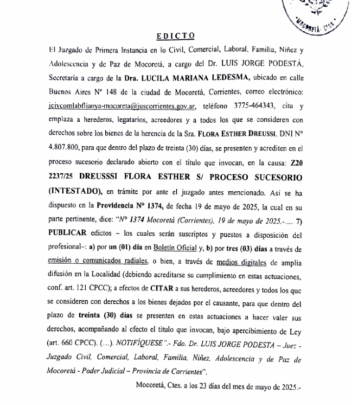 El Juzgado de Primera Instancia en lo Civil, Comercial, Laboral, Familia, Niñez y Adolescencia y de Paz de Mocoretá, a cargo del Dr. LUIS JORGE PODESTA. Secretaría a cargo de la Dra. LUCILA MARIANA LEDESMA, ubicado en calle Buenos Aires N° 148 de la ciudad de Mocoretá, Corrientes, correo electrónico: jcivcomlabflianya-mocoreta@juscorrientes.gov.ar, teléfono 3775-464343, cita y emplaza a herederos, legatarios, acreedores y a todos los que se consideren con derechos sobre los bienes de la herencia de la Sra. FLORA ESTHER DREUSSI, DNI N° 4.807.800, para que dentro del plazo de treinta (30) días, se presenten y acrediten en el proceso sucesorio declarado abierto con el título que invocan, en la causa: Z20 2237/25 DREUSSSI FLORA ESTHER S/ PROCESO SUCESORIO (INTESTADO), en trámite por ante el juzgado antes mencionado. Así se ha dispuesto en la Providencia N° 1374, de fecha 19 de mayo de 2025, la cual en su parte pertinente, dice: «N° 1374 Mocoretá (Corrientes), 19 de mayo de 2025…… 7) PUBLICAR edictos -los cuales serán suscriptos y puestos a disposición del profesional: a) por un (01) día en Boletin Oficial y, b) por tres (03) días a través de emisión o comunicados radiales, o bien, a través de medios digitales de amplia difusión en la Localidad (debiendo acreditarse su cumplimiento en estas actuaciones, conf. art. 121 CPCC); a efectos de CITAR a sus herederos, acreedores y todos los que se consideren con derechos a los bienes dejados por el causante, para que dentro del plazo de treinta (30) días se presenten en estas actuaciones a hacer valer sus derechos, acompañando al efecto el título que invocan, bajo apercibimiento de Ley (art. 660 CPCC). (…). NOTIFIQUESE».- Fdo. Dr. LUIS JORGE PODESTA – Juez -Juzgado Civil, Comercial, Laboral, Familia, Niñez, Adolescencia y de Paz de Mocoreta – Poder Judicial – Provincia de Corrientes».Mocoretá, Ctes, a los 23 días del mes de mayo de 2025.-