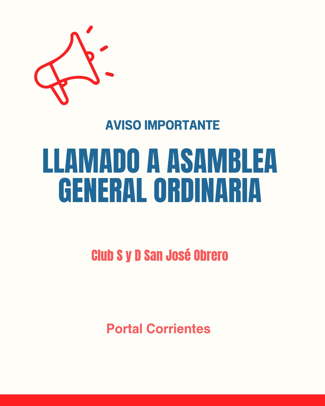 El Club Social y Deportivo San José Obrero convoca a ASAMBLEA GENERAL ORDINARIA a celebrarse el día 6 del mes de mayo, del año 2026, a las 20 horas en la sede social ubicada en José Tomas Martirena n° 520, de la localidad de Mocoretá, provincia de Corrientes, para tratar el siguiente orden del día: