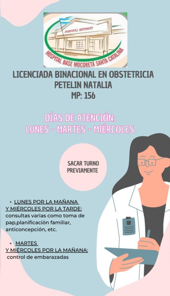 Se trata de la Licenciada Binacional en Obstetricia Petelín Natalia MP 156.