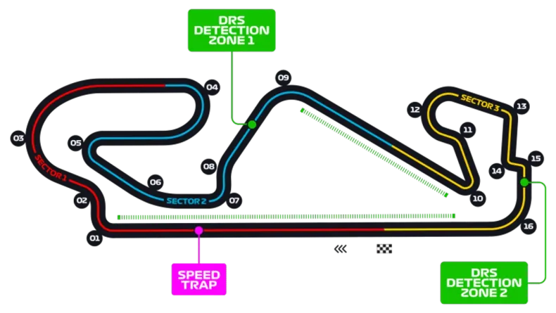 Dificultad para Adelantar: A pesar de su larga recta principal, adelantar en este circuito suele ser un desafío por sus características técnicas y el flujo del aire sucio, lo que hace que la posición de salida en la clasificación sea extremadamente importante.