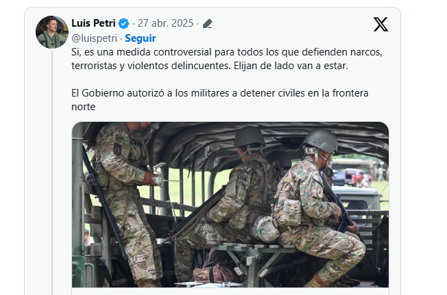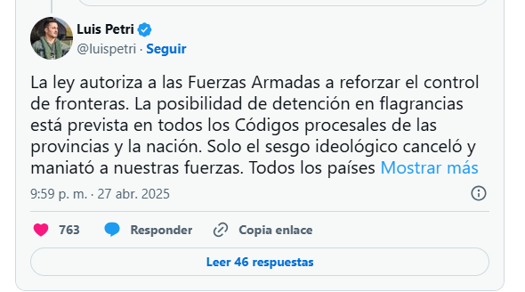 El Gobierno Nacional autorizó a los militares a detener civiles en forma transitoria que hayan cometido delitos de flagrancia, según confirmó Luis Petri. «Sí, es una medida controversial para todos los que defienden narcos, terroristas y violentos delincuentes. Elijan de que lado van a estar», expresó en su cuenta de X.