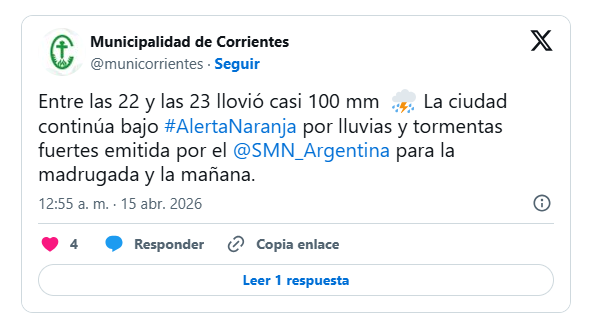 De acuerdo a la información suministrada por la Municipalidad de Corrientes «entre las 22 y 23 horas llovió cerca de 100 milímetros».
