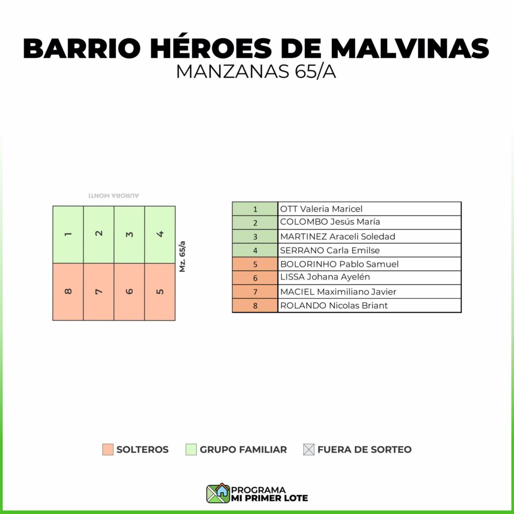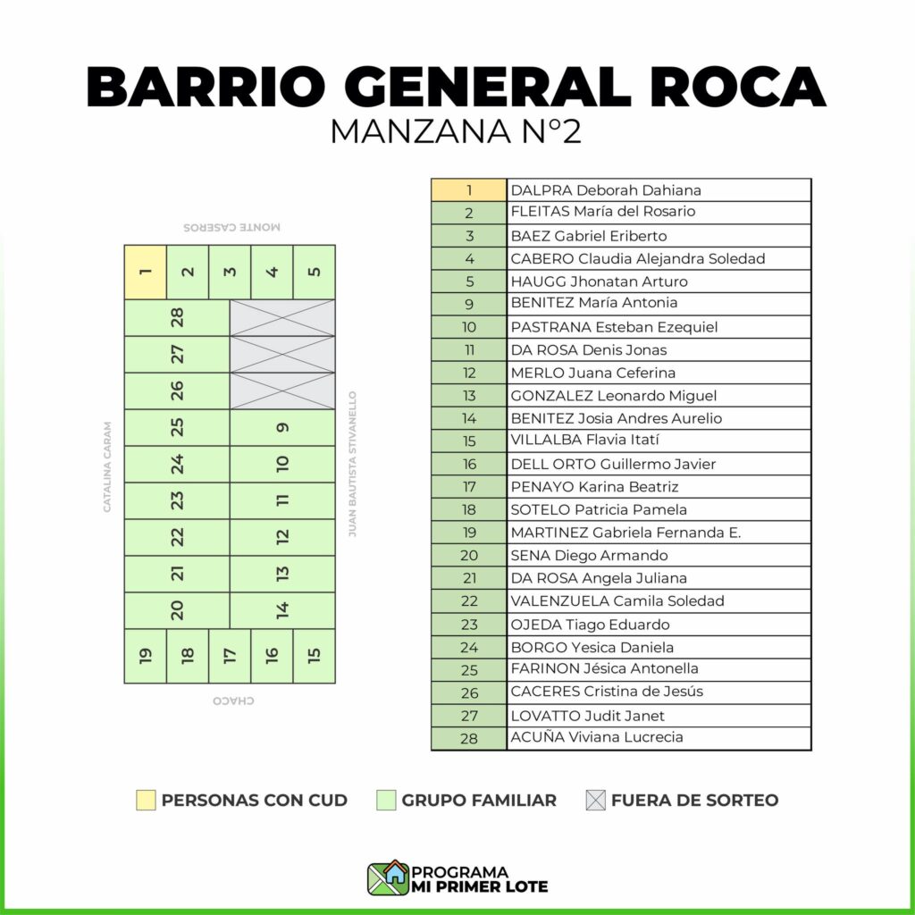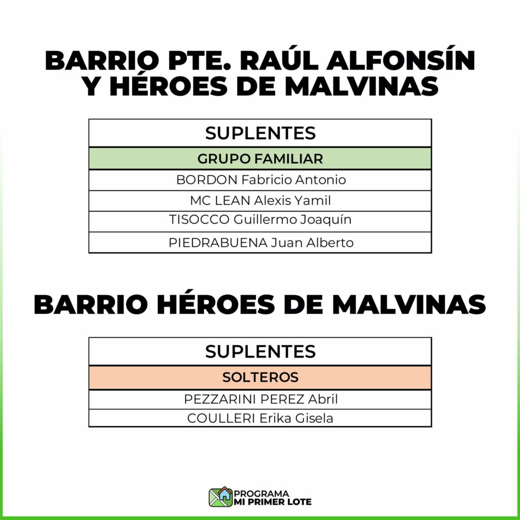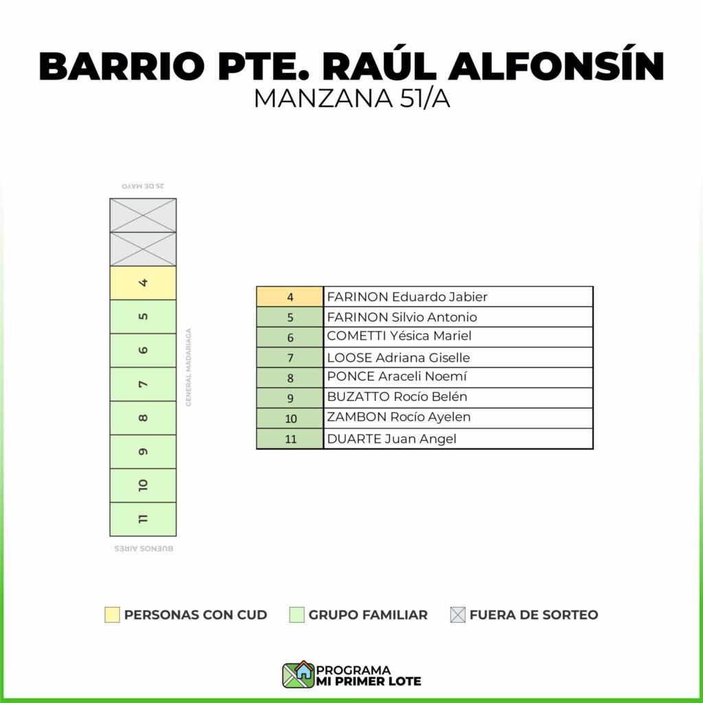 Por otro lado, se da a conocer cómo quedaron conformadas las manzanas del barrio Pte. Raúl Ricardo Alfonsín-, con sus flamantes adjudicatarios. Además, se conformó el listado de beneficiarios suplentes.