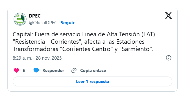 Asimismo en barrios céntricos y periféricos se produjeron cortes en la energía eléctrica. DPEC informó sobre la salida de Línea de Alta Tensión (LAT) «Resistencia – Corrientes» que afectó a las Estaciones Transformadoras «Corrientes Centro» y «Sarmiento». Se trabaja en la normalización y progresivo reestablecimiento del servicio.