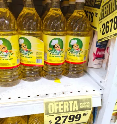 Por otra parte en una cadena mayorista con venta al por menor, las botellas de la desconocida firma «Cheff Soldini» de girasol se obtenían por $2.800; seguían Cocinero por $3.477 y Lira por 3.620. Luego, solo se podían obtener de un litro y medio por valores de $4.699 (Cañuelas) y $4.890 (Legítimo). Mientras que el Cocinero era el más costoso por $6.000.