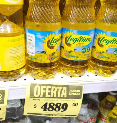 Dentro de la variedad de girasol, lo más económico era la firma Legítimo por $3.369, Cañuelas a $3.729, luego Natura por $3.859 y Cocinero por $3.900. Después ya se conseguían las botellas de 1,5 litros desde precios que arrancaban en $5.369 y podían llegar a $6.000 para la variedad de oliva con girasol.