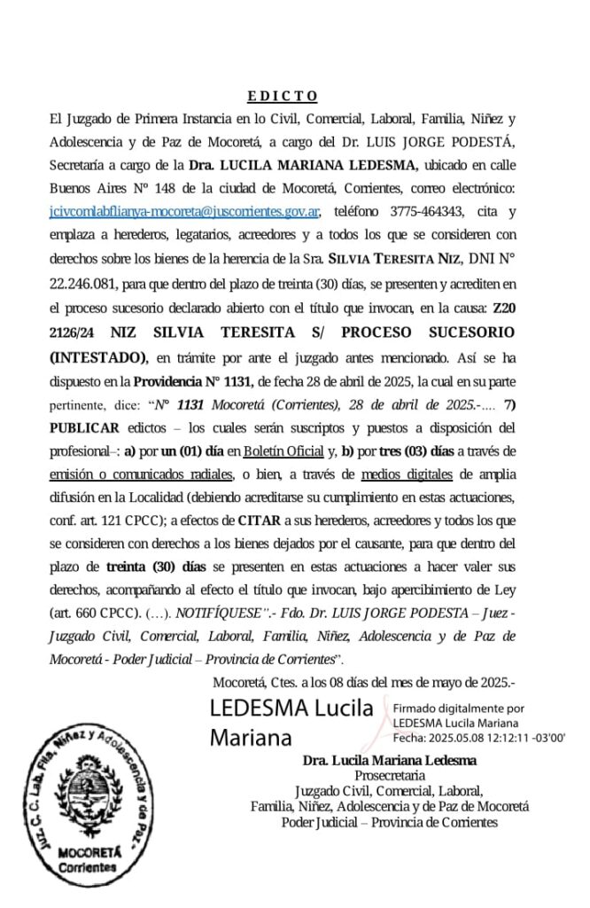 El Juzgado de Primera Instancia en lo Civil, Comercial, Laboral, Familia, Niñez y Adolescencia y de Paz de Mocoretá, a cargo del Dr. LUIS JORGE PODESTÁ, Secretaría a cargo de la Dra. LUCILA MARIANA LEDESMA, ubicado en calle Buenos Aires Nº 148 de la ciudad de Mocoretá, Corrientes, correo electrónico: jcivcomlabflianya-mocoreta@jusconientes.gov.ar, teléfono 3775-464343, cita y emplaza a herederos, legatarios, acreedores y a todos los que se consideren con derechos sobre los bienes de la herencia de la Sra. SILVIA TERESITA NIZ, DNI N° 22.246.081, para que dentro del plazo de treinta (30) días, se presenten y acrediten en el proceso sucesorio declarado abierto con el título que invocan, en la causa: Z20 2126/24 NIZ SILVIA TERESITA S/ PROCESO SUCESORIO (INTESTADO), en trámite por ante el juzgado antes mencionado. Así se ha dispuesto en la Providencia N° 1131, de fecha 28 de abril de 2025, la cual en su parte pertinente, dice: «N° 1131 Mocoretá (Corrientes), 28 de abril de 2025.-…. 7) PUBLICAR edictos los cuales serán suscriptos y puestos a disposición del profesional: a) por un (01) día en Boletín Oficial y, b) por tres (03) días a través de emisión o comunicados radiales, o bien, a través de medios digitales de amplia difusión en la Localidad (debiendo acreditarse su cumplimiento en estas actuaciones, conf. art. 121 CPCC); a efectos de CITAR a sus herederos, acreedores y todos los que se consideren con derechos a los bienes dejados por el causante, para que dentro del plazo de treinta (30) días se presenten en estas actuaciones a hacer valer sus derechos, acompañando al efecto el título que invocan, bajo apercibimiento de Ley (art. 660 CPCC). (…).