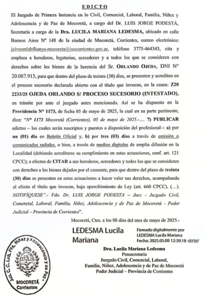 El Juzgado de Primera Instancia en lo Civil, Comercial, Laboral, Familia, Niñez y Adolescencia y de Paz de Mocoretá, a cargo del Dr. LUIS JORGE PODESTA, Secretaria a cargo de la Dra. LUCILA MARIANA LEDESMA, ubicado en calle Buenos Aires N° 148 de la ciudad de Mocoretá, Corrientes, correo electrónico: jcivcomlabflianya-mocoreta@juscorrientes.gov.ar, teléfono 3775-464343, cita y emplaza a herederos, legatarios, acreedores y a todos los que se consideren con derechos sobre los bienes de la herencia del Sr. ORLANDO OJEDA, DNI N° 20.087.915, para que dentro del plazo de treinta (30) días, se presenten y acrediten en el proceso sucesorio declarado abierto con el título que invocan, en la causa: Z20 2233/25 OJEDA ORLANDO S/ PROCESO SUCESORIO (INTESTADO), en trámite por ante el juzgado antes mencionado. Así se ha dispuesto en la Providencia Nº 1173, de fecha 05 de mayo de 2025, la cual en su parte pertinente, dice: «N° 1173 Mocoretá (Corrientes), 05 de mayo de 2025.-…. 7) PUBLICAR edictos los cuales serán suscriptos y puestos a disposición del profesional: a) por un (01) día en Boletín Oficial y, b) por tres (03) días a través de emisión o comunicados radiales, o bien, a través de medios digitales de amplia difusión en la Localidad (debiendo acreditarse su cumplimiento en estas actuaciones, conf. art. 121 CPCC); a efectos de CITAR a sus herederos, acreedores y todos los que se consideren con derechos a los bienes dejados por el causante, para que dentro del plazo de treinta (30) días se presenten en estas actuaciones a hacer valer sus derechos, acompañando al efecto el titulo que invocan, bajo apercibimiento de Ley (art. 660 CPCC). (…). NOTIFIQUESE». Fdo. Dr. LUIS JORGE PODESTA Juez Juzgado Civil, Comercial, Laboral, Familia, Niñez, Adolescencia y de Paz de Mocoretă – Poder Judicial-Provincia de Corrientes».Mocoretá, Ctes, a los 08 días del mes de mayo de 2025.-