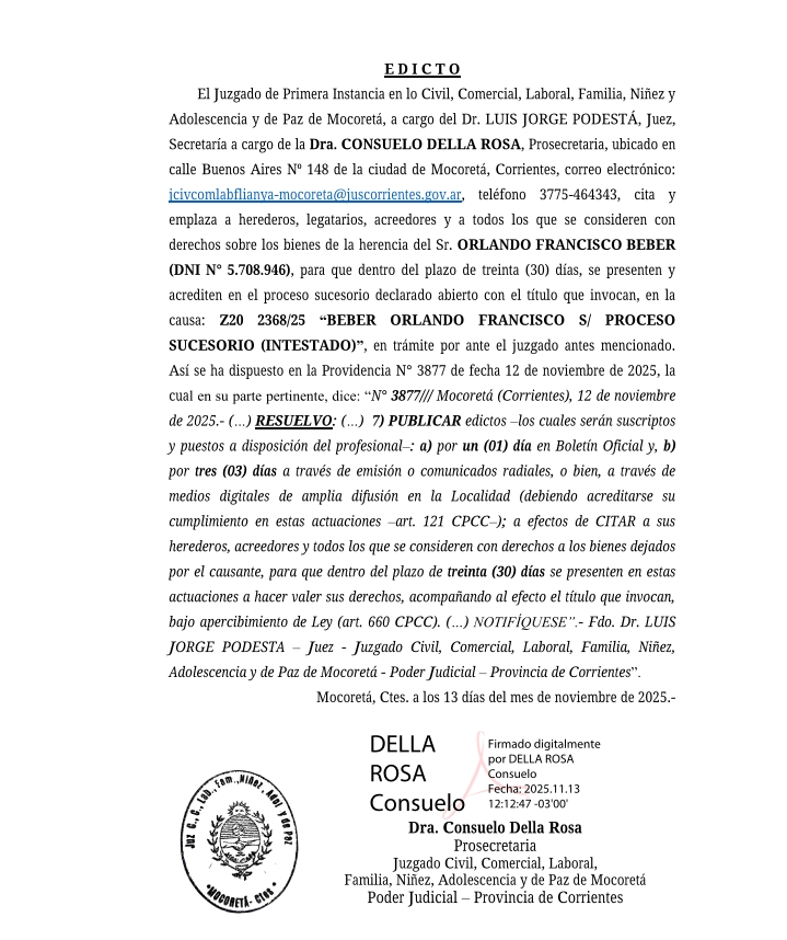 El Juzgado de Primera Instancia en lo Civil, Comercial, Laboral, Familia, Niñez y Adolescencia y de Paz de Mocoretá, a cargo del Dr. LUIS JORGE PODESTA, Juez, Secretaría a cargo de la Dra. CONSUELO DELLA ROSA, Prosecretaria, ubicado en calle Buenos Aires Nº 148 de la ciudad de Mocoretá, Corrientes, correo electrónico: icivcomlabflianya-mocoreta@juscorrientes.gov.ar, teléfono 3775-464343, cita y emplaza a herederos, legatarios, acreedores y a todos los que se consideren con derechos sobre los bienes de la herencia del Sr. ORLANDO FRANCISCO BEBER (DNI N° 5.708.946), para que dentro del plazo de treinta (30) días, se presenten y acrediten en el proceso sucesorio declarado abierto con el título que invocan, en la causa: Z20 2368/25 «BEBER ORLANDO FRANCISCO S/ PROCESO SUCESORIO (INTESTADO)», en trámite por ante el juzgado antes mencionado. Así se ha dispuesto en la Providencia N° 3877 de fecha 12 de noviembre de 2025, la cual en su parte pertinente, dice: «N° 3877/// Mocoretá (Corrientes), 12 de noviembre de 2025.- (…) RESUELVO: (…) 7) PUBLICAR edictos-los cuales serán suscriptos y puestos a disposición del profesional: a) por un (01) día en Boletín Oficial y, b) por tres (03) días a través de emisión o comunicados radiales, o bien, a través de medios digitales de amplia difusión en la Localidad (debiendo acreditarse su cumplimiento en estas actuaciones art. 121 CPCC); a efectos de CITAR a sus herederos, acreedores y todos los que se consideren con derechos a los bienes dejados por el causante, para que dentro del plazo de treinta (30) días se presenten en estas actuaciones a hacer valer sus derechos, acompañando al efecto el título que invocan, bajo apercibimiento de Ley (art. 660 CPCC). (…) NOTIFIQUESE».- Fdo. Dr. LUIS JORGE PODESTA Juez Juzgado Civil, Comercial, Laboral, Familia, Niñez, Adolescencia y de Paz de Mocoretá – Poder Judicial – Provincia de Corrientes».