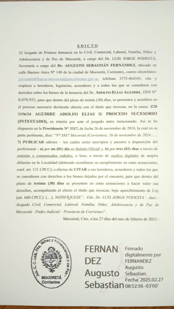 El Juzgado de Primera Instancia en lo Civil, Comercial, Laboral, Familia, Niñez y Adolescencia y de Paz de Mocorctá, a cargo del Dr. LUIS JORGE PODESTÁ, Secretaría a cargo del Dr. AUGUSTO SEBASTIÁN FERNÁNDEZ, ubicado en calle Buenos Aires N° 148 de la ciudad de Mocoretá, Corrientes, correo electrónico: jcivcomlabflianya-mocoreta@juscorrientes,gov.ar, teléfono 3775-464343, cita y emplaza a heroderos, legatarios, acreedores y a todos los que se consideren con derechos sobre los bienes de la berencia del Sr. ADOLFO ELÍAS AGUIRRE, DNI NO 8.079.935, para que dentro del plazo de treinta (30) días, se presenten y acrediten en el proceso sucesorio declarado abierto con el titulo que invocan, en la causa: 720 2156/24 AGUIRRE ADOLFO ELIAS S/ PROCESO SUCESORIO (INTESTADO), en trámite por ante el juzgado antes mencionado. Asi se ha dispuesto en la Providencia Nº 3317, de fecha 26 de noviembre de 2024, la cual en su parte pertinente, dice: “N° 3317 Mocoretá (Corrientes), 26 de noviembre de 2024.-…. 7) PUBLICAR edictos los cuales serán suscriptos y puestos a disposición del profesional: a) por un (01) dia cu Boletin Oficial y, b) por tres (03) dias a través de emisión o comunicados radiales, o bien, a través de medios digitales de amplia difusión en la Localidad (debiendo acreditarse su cumplimiento en estas actuaciones, conf. art. 121 CPCC); a efectos de CITAR a sus berederos, acreedores y todos los que se consideren con derechos a los bienes dejados por el causante, para que dentro del plazo de treinta (30) días se presenten en estas actuaciones a hacer valer sus derechos, acompañando al efecto el titulo que invocan, bajo apercibimiento de Ley (art. 660 CPCC). (…). NOTIFIQUESE”-Fdo. Dr. LUIS JORGE PODESTA – Juez -Juzgado Civil, Comercial, Laboral, Familia, Niñez, Adolescencia y de Paz de Mocoretá-Poder Judicial-Provincia de Corrientes”.