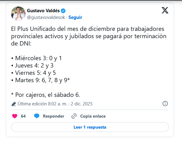 A través de sus redes sociales, gustavovaldesok, el primer mandatario correntino Gustavo Valdés dio a conocer el comienzo desde este miércoles 3, del cronograma de pago del Adicional Remunerativo Mensual (Plus Unificado) correspondiente a diciembre, de $110 mil, que alcanza a los agentes activos, jubilados y pensionados de la administración pública provincial.