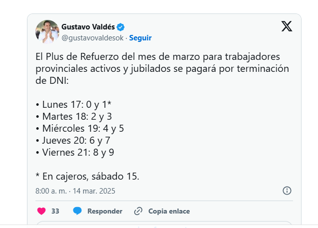 El plus de refuerzo del mes de marzo para trabajadores provinciales activos y jubilados se pagará desde el lunes 17 de marzo, por terminación de DNI.