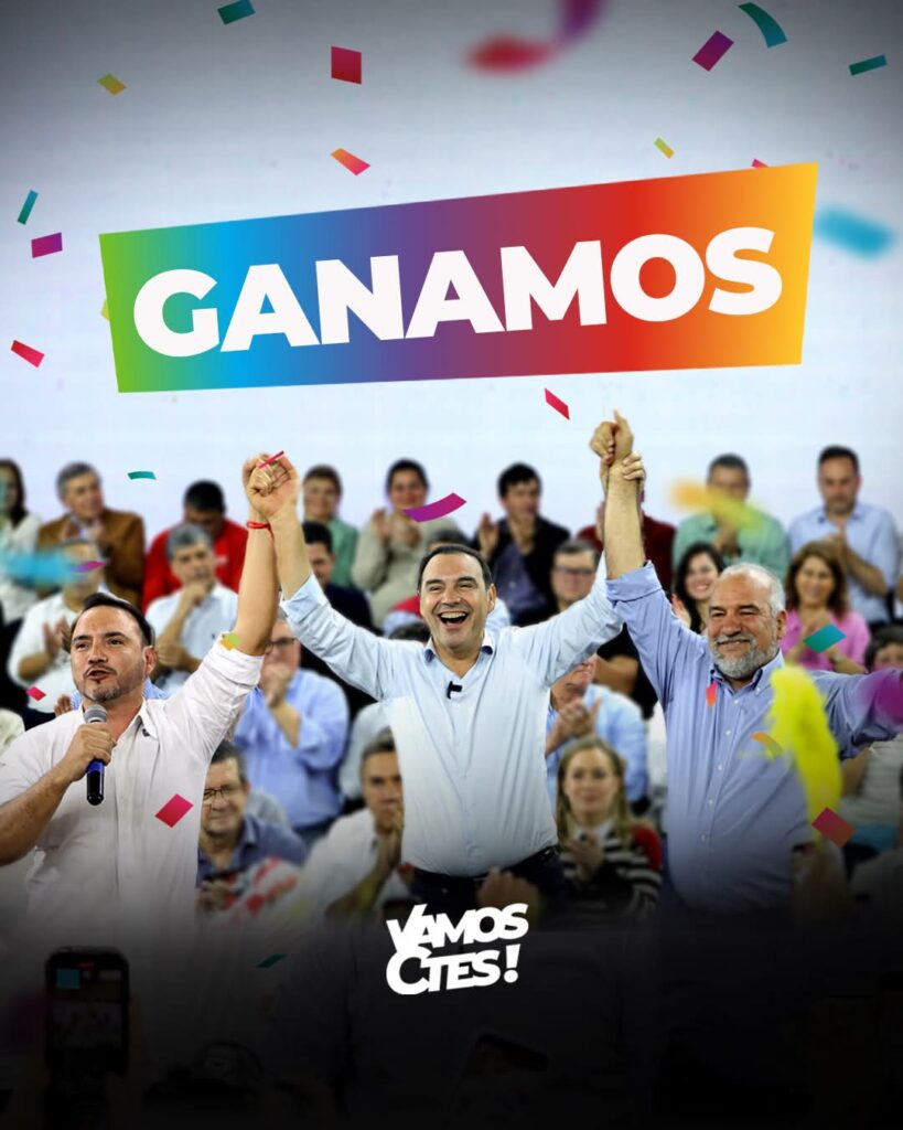“A todos los correntinos que depositaron su confianza, gracias. A todos los fiscales que siguen en las escuelas, defiendan el voto: el cambio está más cerca que nunca”, expresó el mandatario al proclamarse ganador.