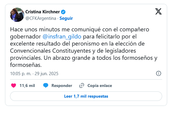 «Hace unos minutos me comuniqué con el compañero gobernador Insfrán para felicitarlo por el excelente resultado del peronismo en la elección de convencionales constituyentes y de legisladores provinciales. Un abrazo grande a todos los formoseños y formoseñas», expresó Fernández de Kirchner desde su prisión domiciliaria en el barrio porteño de Constitución, donde cumple su condena a 6 años por la «Causa Vialidad».
