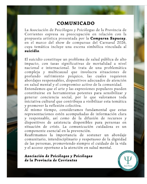 La Asociación de Psicólogos y Psicólogas de la Provincia de Corrientes manifestó su preocupación por la propuesta artística presentada por la comparsa Sapucay durante el show de comparsas del Carnaval 2026, cuya temática incluye una escena simbólica vinculada al suicidio.