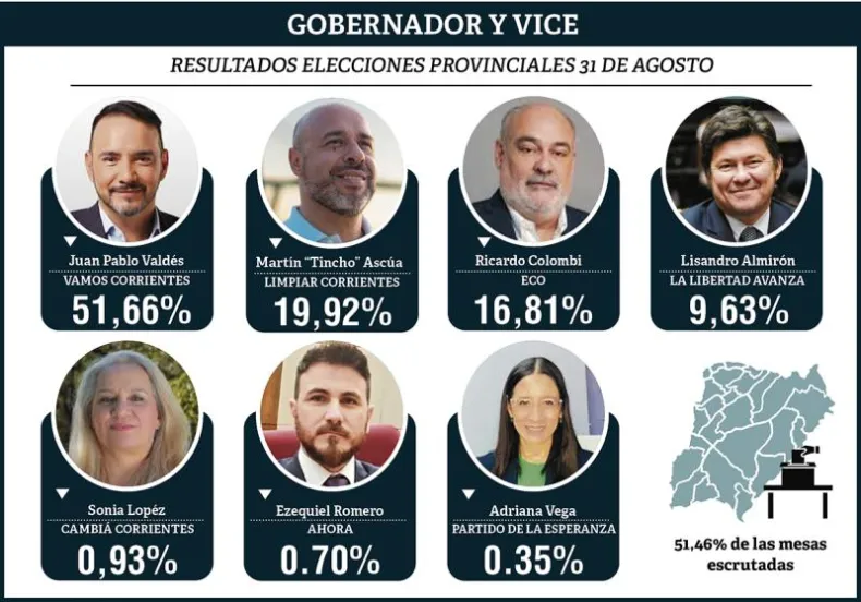 El candidato del oficialista Vamos Corrientes se alzó con un triunfo en las urnas que le permitió ser el sucesor de su hermano, Gustavo Valdés, en el «sillón de Ferré». A pesar de las enormes complicaciones por la falta de datos oficiales, los candidatos de la oposición admitieron la derrota. Será el Gobernador más joven desde el regreso de la democracia.