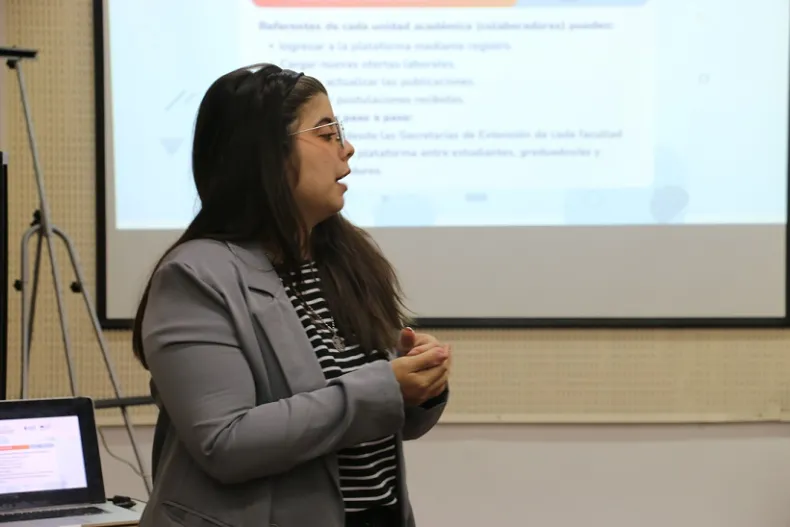 Sabrina Pedevila, responsable a cargo de la Bolsa de Empleo de la UNNE, explicó durante el encuentro que esta herramienta, integrada dentro de la plataforma Universia, constituye «una red de trabajo que va a unir en simultáneo a empresas, a universidades, en nuestro caso a nuestras unidades académicas y aquellos usuarios que están interesados en buscar alguna oferta laboral».