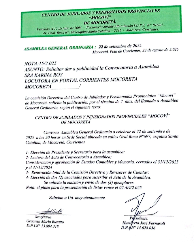 Convoca Asamblea General Ordinaria a celebrar el 22 de setiembre de 2025 a las 20 horas en Sede Social ubicada en calles Gral Roca N°697, esquina Santa Catalina, de Mocoretá, Corrientes.