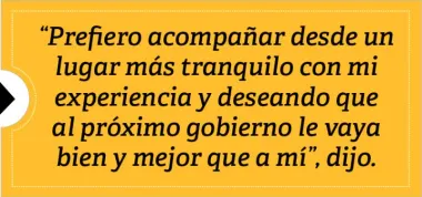 Además, sostuvo: «Prefiero acompañar desde un lugar más tranquilo con mi experiencia y deseando que al próximo gobierno le vaya bien y mejor que a mí».
