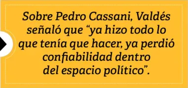 En cuanto a su relación con el presidente de la Cámara de Diputados y exaliado, Pedro Cassani, líder de ELI y hoy enfrentado con el oficialismo, Valdés señaló: «Ya hizo todo lo que tenía que hacer, ya perdió confiabilidad dentro del espacio político».