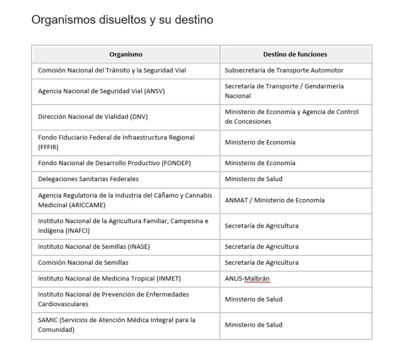 Entre los organismos disueltos se encuentran la Comisión Nacional del Tránsito y la Seguridad Vial, la Agencia Nacional de Seguridad Vial (ANSV), la Dirección Nacional de Vialidad, el Fondo Fiduciario Federal de Infraestructura Regional, el fideicomiso FONDEP, las Delegaciones Sanitarias Federales del Ministerio de Salud, la Agencia Regulatoria de la Industria del Cáñamo y del Cannabis Medicinal (ARICCAME), el Instituto Nacional de la Agricultura Familiar, Campesina e Indígena (INAFCI), el Instituto Nacional de Semillas (INASE) y la Comisión Nacional de Semillas, entre otros. En algunos casos, como el del Instituto Nacional de Medicina Tropical, se justificó la eliminación por superposición de funciones y falta de resultados concretos.