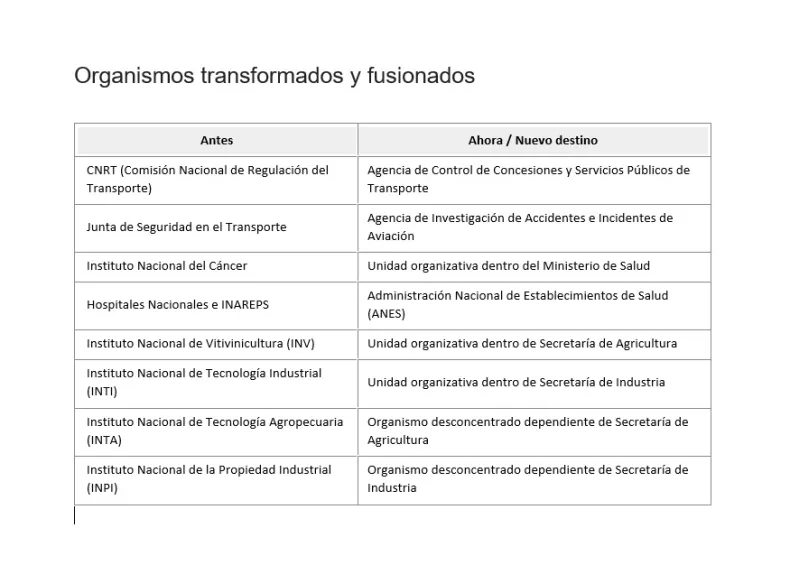 Otros organismos fueron transformados en unidades organizativas dependientes de ministerios, como el Instituto Nacional del Cáncer, el Instituto Nacional de Tecnología Industrial (INTI) y el Instituto Nacional de Vitivinicultura (INV). La CNRT se transformó en la nueva Agencia de Control de Concesiones y Servicios Públicos de Transporte, y la Junta de Seguridad en el Transporte se reconvirtió en la Agencia de Investigación de Accidentes e Incidentes de Aviación, con competencias limitadas a la investigación aeronáutica.
