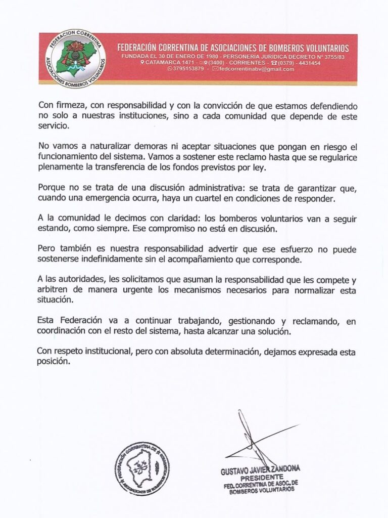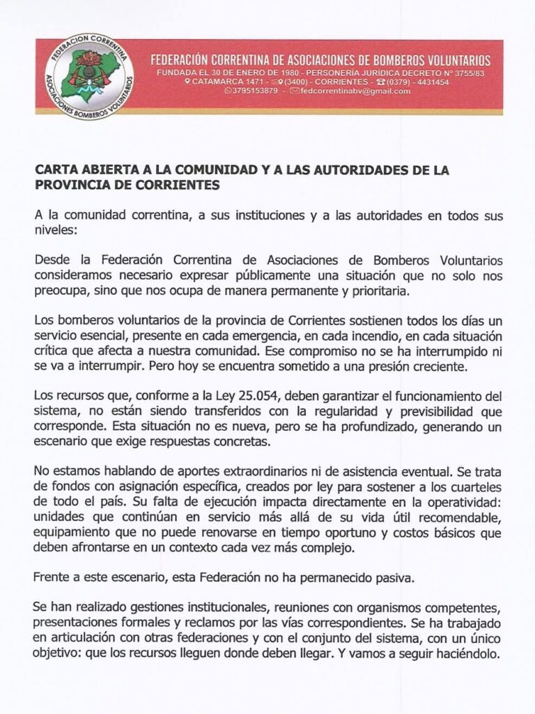 La Federación Correntina de Asociaciones de Bomberos Voluntarios hizo pública en las últimas horas una carta abierta dirigida a la comunidad y a las autoridades provinciales y nacionales, en la que expone una problemática que afecta de manera directa al funcionamiento del sistema de emergencias en la provincia y en todo el país.