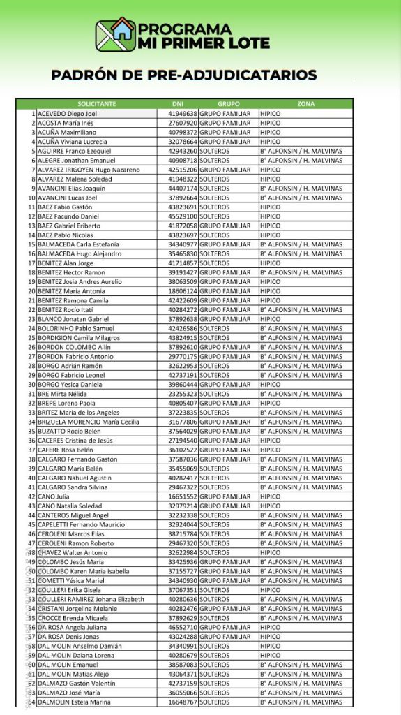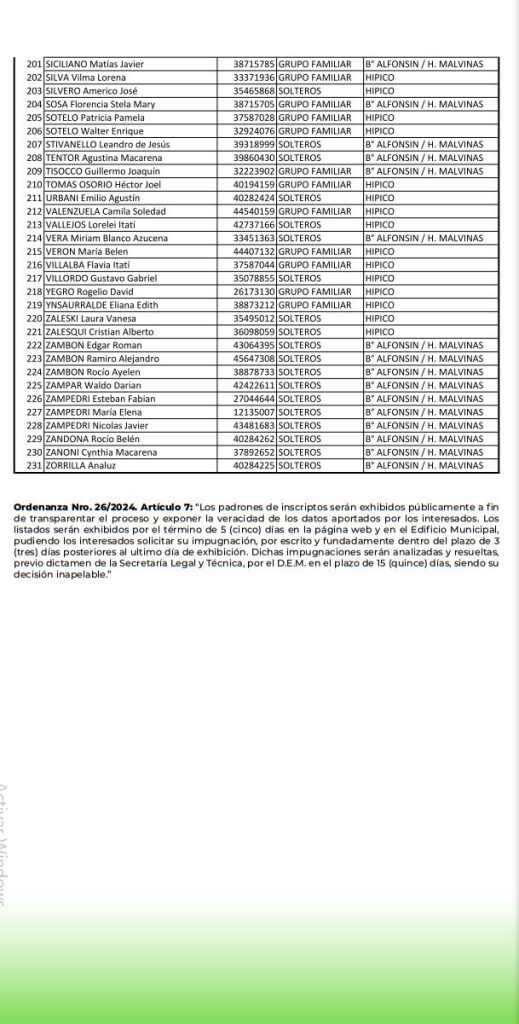 De este modo, se elaboró el padrón de preadjudicatarios al Programa, conformado por 231 vecinos de la ciudad. El mismo estará expuesto a fin de transparentar el proceso y exponer la veracidad de los datos aportados por los interesados. en la planta baja de ingreso al edificio municipal desde este viernes 07 y hasta el viernes 14, inclusive, plazo en el que se podrán realizar impugnaciones -por escrito y fundamentación, dentro del plazo de hasta 3 (tres) días posteriores al último día de exhibición. Dichas impugnaciones serán analizadas y resueltas, previo dictamen de la Secretaría Legal y Técnica, por el D.E.M. en el plazo de 15 (quince) días, siendo su decisión inapelable.