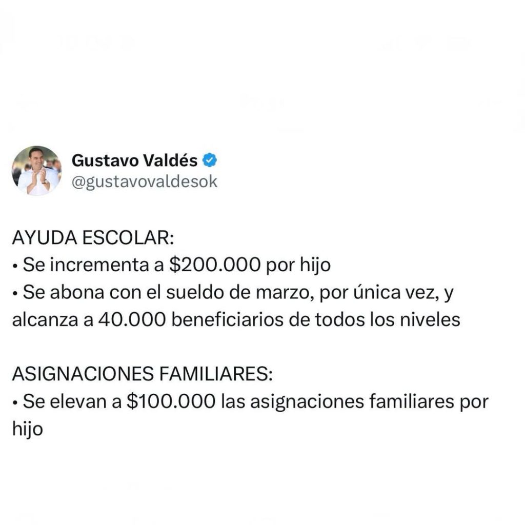 Rivas Piasentini inició la conferencia de prensa expresando que: «existe un esfuerzo muy significativo del tesoro provincial y la decisión de generar un incremento salarial está por encima de la inflación». En cuanto a la ayuda escolar, señaló que: «todos los años en el mes de marzo, iniciamos la ayuda escolar. Esta vez pasará a 200 mil pesos por hijo escolar, llegando a 44 mil beneficiarios».