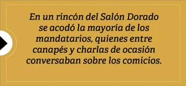 En un rincón del Salón Dorado, en el primer piso del Colón se acodó la mayoría de los mandatarios, quienes entre canapés y charlas de ocasión conversaban sobre los comicios del domingo y el panorama electoral.